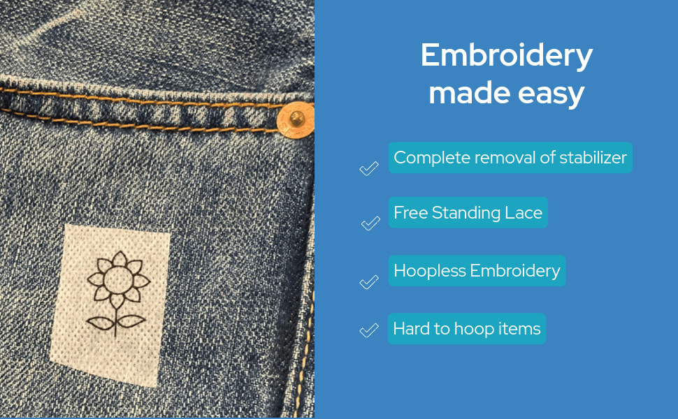 - Multiple uses. Adhesive Backed Wash Away stabilizer can also be used to make Free Standing Lace, bookmarks, mug rugs, bookmarks, paper piecing, applique, quilting, etc. Can also be used as topping to prevent fabric from showing through.