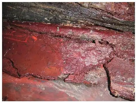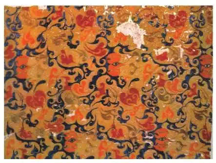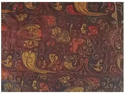 The chain-stitch fragments excavated from the Haihunhou tomb retain a remarkably saturated chromaticity, presumably achieved with silk threads dyed with cinnabar. Their iconographic idiom parallels the celebrated Han embroideries from Mawangdui (Changsha) and Laoshan (Beijing)—notably the “Riding-the-Clouds” (chengyun xiu) and “Longevity” (changshou xiu) patterns. Although the supporting textile substrates have suffered severe biodegradation, the stitch trajectories and decorative syntax of the chain stitching remain legible on the surviving lacquer coffer fragments and coffin boards; nevertheless, their extraction and stabilization present exceptional technical challenges.